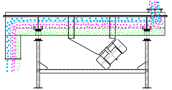 直線(xiàn)篩是一種大產(chǎn)量的篩分設(shè)備,采用振動(dòng)電機(jī)作為激振源,使煙葉在篩網(wǎng)上被拋起,同時(shí)向前做直線(xiàn)運(yùn)動(dòng),煙葉在給料機(jī)上均勻地進(jìn)入篩分機(jī)的進(jìn)料口,通過(guò)多層的篩網(wǎng)產(chǎn)生數(shù)種規(guī)格的篩上物和篩下物,分別從各自的出口排出,完成篩分作業(yè)。