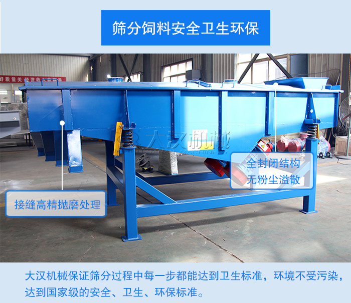 大漢機械生產的1540型直線振動篩采用多種等級碳鋼、不銹鋼精制而成,內部所有接縫高精拋磨處理,密封件材質均符合養(yǎng)殖業(yè)的安全標準。它全封閉的結構也可保證飼料在篩分過程中無粉塵溢散等情況發(fā)生。