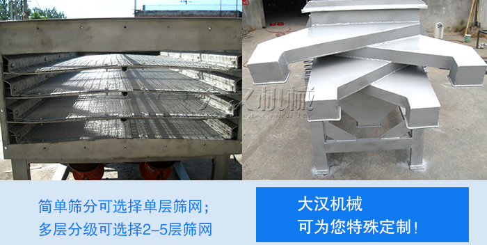 同時在篩網的安裝上也有多種選擇,簡單篩分可選擇單層篩網;多層分級可選擇2-5層篩網,至于篩分比例(篩上物和篩下物)和現場空間的大小也可以直接和我們聯系,根據您的要求來為您特殊定制!