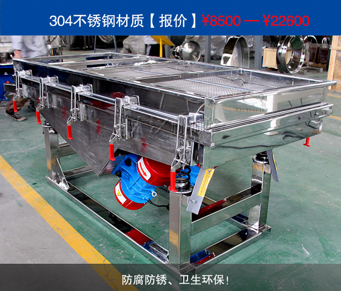 304不銹鋼材質(zhì)的直線篩是采用304不銹鋼材質(zhì)(兩種結(jié)構(gòu)規(guī)格:一、整機(jī)均采用不銹鋼制成;二、物料接觸不分為不銹鋼材質(zhì),底座為碳鋼材質(zhì)),它是食品、醫(yī)藥、化工級專用材質(zhì),雖然我們要篩分的是化學(xué)物料石英砂,但是對于衛(wèi)生環(huán)境要求較高的企業(yè)這也是不錯(cuò)的選擇。