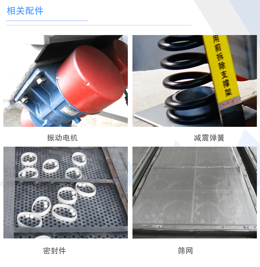 直線振動(dòng)篩的配件包含:振動(dòng)電機(jī)、減震彈簧、密封件、篩網(wǎng)、清網(wǎng)裝置,振動(dòng)電機(jī)作為一臺(tái)篩分設(shè)備的動(dòng)力源其優(yōu)劣直接關(guān)系到設(shè)備的產(chǎn)量與使用壽命,篩網(wǎng)的選用也應(yīng)該注重篩網(wǎng)的絲經(jīng)、材質(zhì),選擇不同配置的設(shè)備,其價(jià)格會(huì)有所影響。