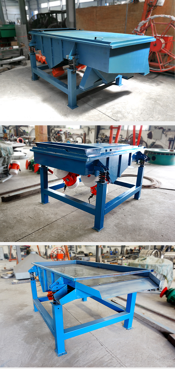 本品為1000mm(寬)x2000mm(長)一層兩個出料口碳鋼材質(zhì)鐵質(zhì)網(wǎng)架結(jié)構(gòu)直線篩。
